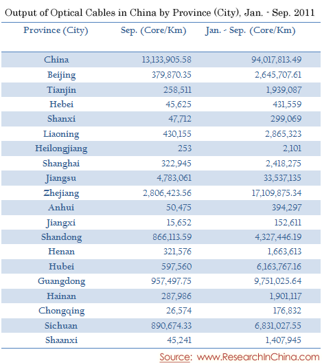 Output of Optical Cables in China by Province (City), Jan. - Sep. 2011