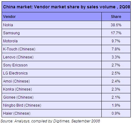 China Handset Vendor Market Share by Sales Volume, 2008Q2