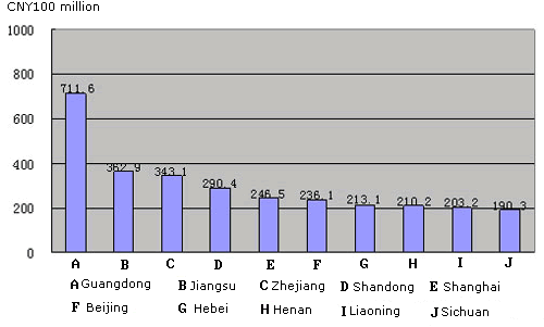 Top Ten Provinces by Telecom Service Revenue, Jan-Jul 2008