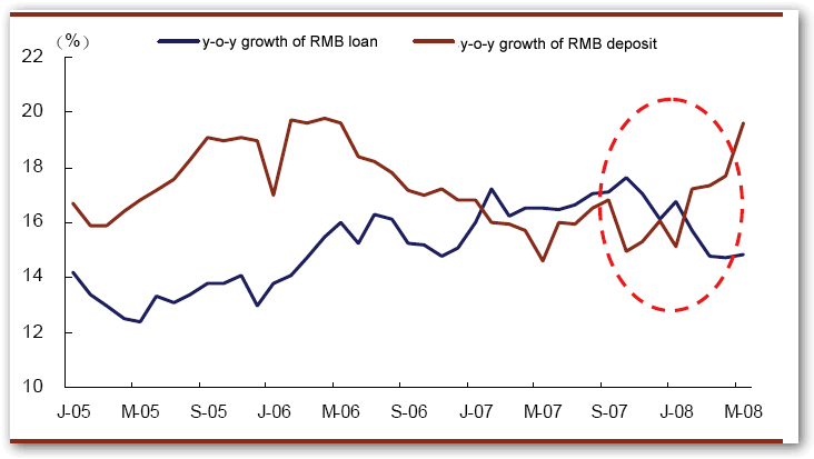 Y-O-Y Growth of RMB Deposit and Loan, 2005-May 2008