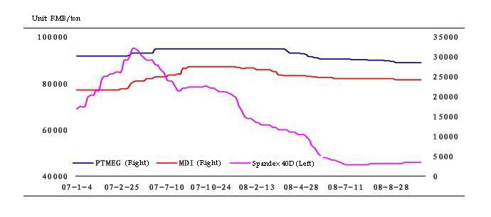 Spandex 40D and Raw Materials Price, 2007-Aug, 2008