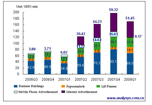 Focus Media Advertisement Operating Revenue, Q3 2006-Q1 2008