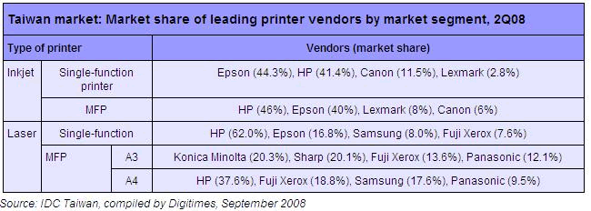 Taiwan Market: Market Share of Leading Printer Vendors by Market Segment, 2Q08