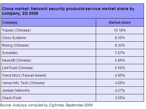 China's Network Security Products/Service Market Share by Company, Q2 2008