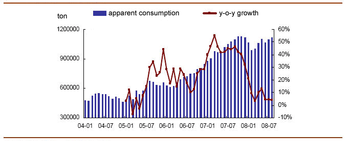 Apparent Consumption of Electrolytic Aluminium in China, 2004-Jul. 2008