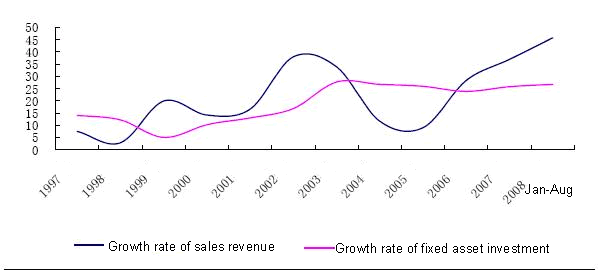 Growth Rate of Fixed Asset Investment and Sales Revenue of Construction Machinery Industry, 1997-Aug 2008
