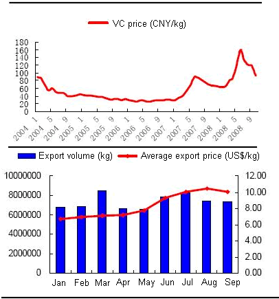Vitamin C Price Trend & Export Volume and Price of VC and Its Derivative, Jan-Sep 2008