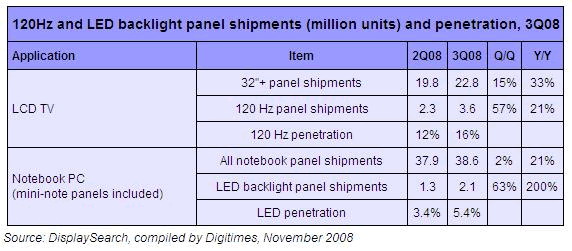 120Hz & LED Backlight Panel Shipments and Penetration, 2008Q3