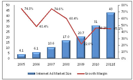 Market Size and Growth Rate of China Online Advertising, 2005-2011E
