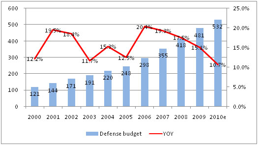 Expenditure of China National Defense Budget, 2000-2010 (RMB in Billions)
