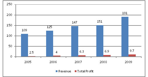 Revenue and Profit of Aviation Industry Corporation of China, 2005-2009 (RMB in Billion)
