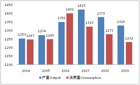 Global Nickel Output and Consumption, 2004-2009 (1,000 Ton)