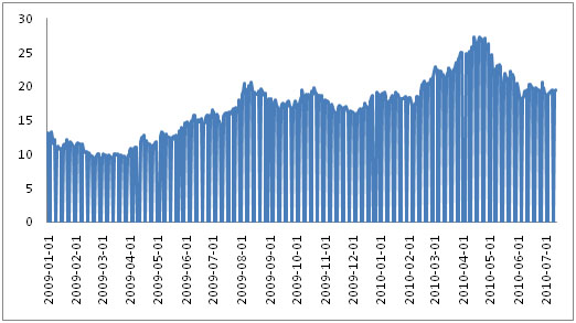 A Three-Month Closing Price Trend of Nickel in LME, 2009-Jul.13, 2010 (USD1000/Ton)