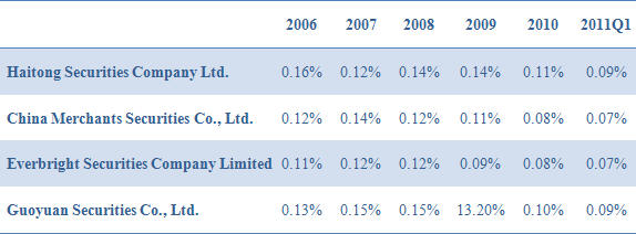 Commission Rate of Four Securities Companies in China, 2006-2011Q1