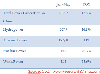 Power Generation in China, Jan.-May 2011(Unit: KWh Bn)
