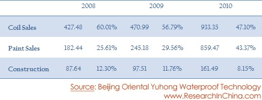 Sales Revenue and Proportion of Beijing Oriental Yuhong Waterproof Technology by Product, 2008-2010(Unit:RMB mln )