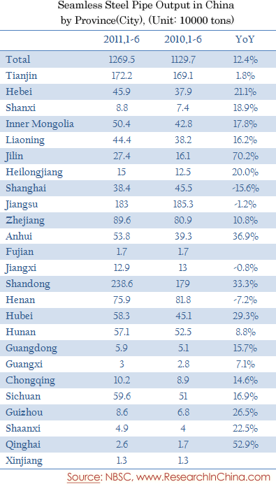 Seamless Steel Pipe Output in China by Province(City), 2011H1