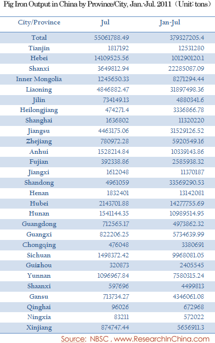 Pig Iron Output in China by Province/City, Jan.-Jul. 2011
