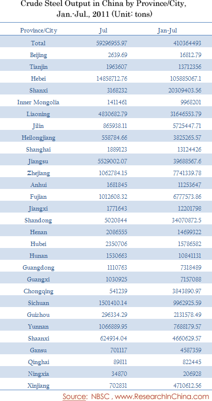 Crude Steel Output in China by Province/City, Jan.-Jul., 2011