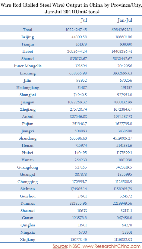 Wire Rod (Rolled Steel Wire) Output in China by Province/City, Jan-Jul 2011
