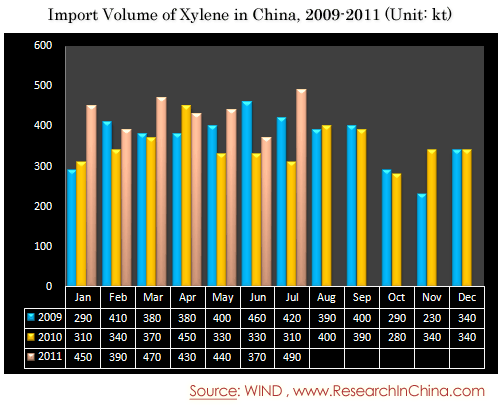 Import Volume of Xylene in China, 2009-2011