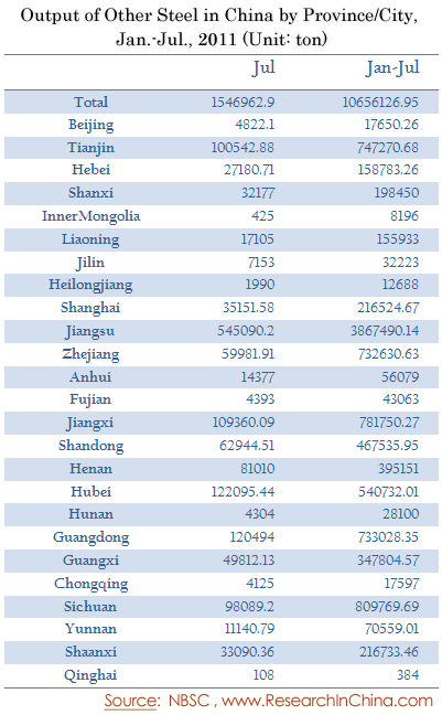 Output of Other Steel in China by Province/City, Jan.-Jul., 2011