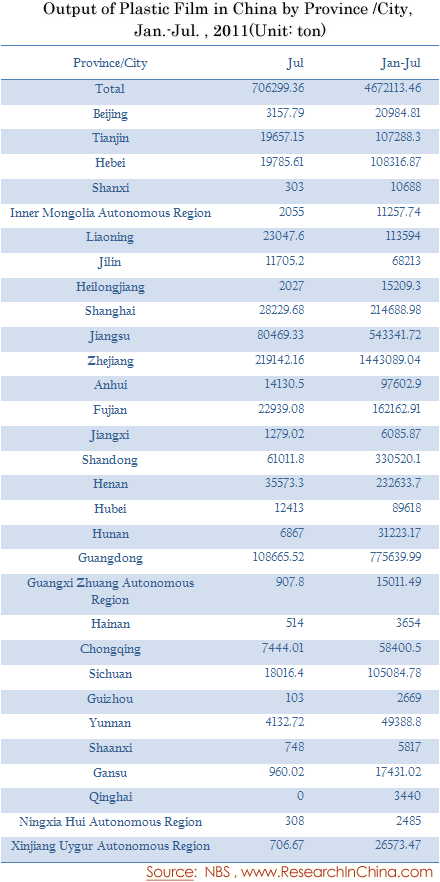 Output of Plastic Film in China by Province /City, Jan.-Jul. 2011