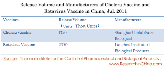 Release Volume and Manufacturers of Cholera Vaccine and Rotavirus Vaccine in China, Jan.-Jul. 2011
