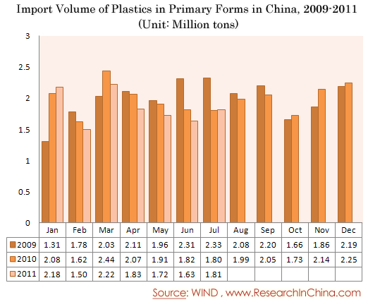 Import Volume of Plastics in Primary Forms in China, 2009-2011