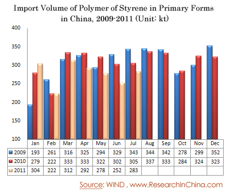Import Volume of Polymer of Styrene in Primary Forms in China, 2009-2011