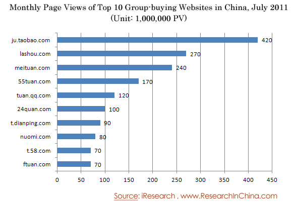Monthly Page Views of Top 10 Group-buying Websites in China, July 2011 (1,000,000PV)