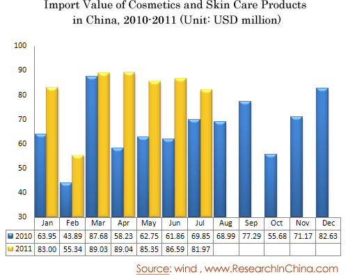 Import Value of Cosmetics and Skin Care Products in China, 2010-2011