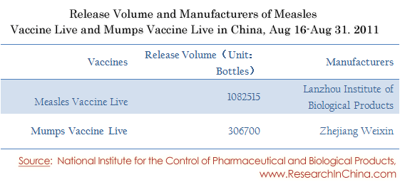 Release Volume and Manufacturers of Measles Vaccine Live and Mumps Vaccine Live in China, Aug 16-Aug 31. 2011