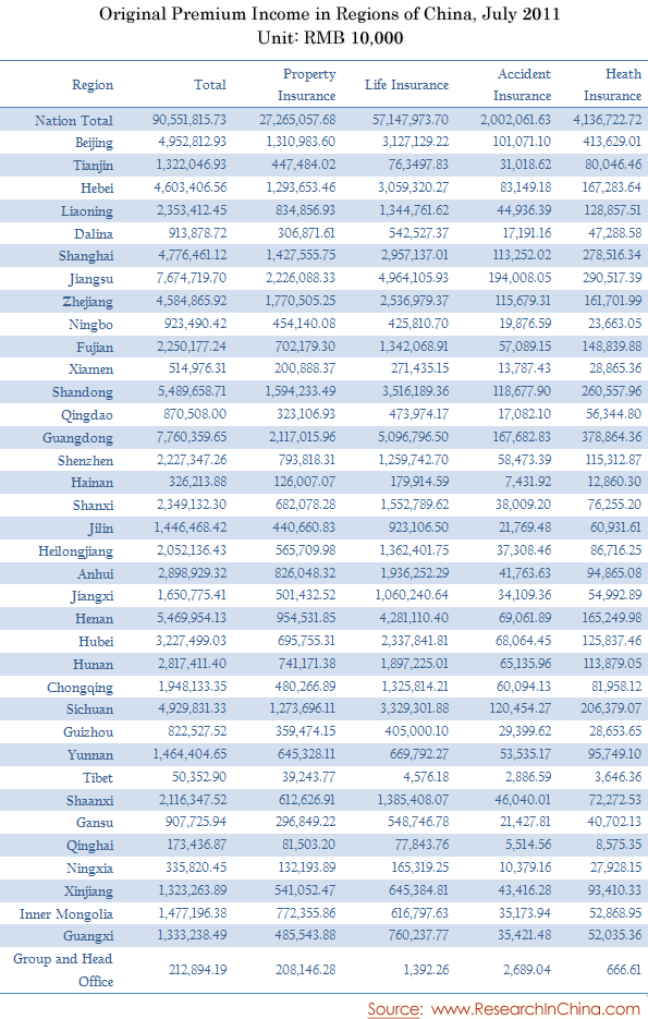 Original Premium Income in Regions of China, July 2011