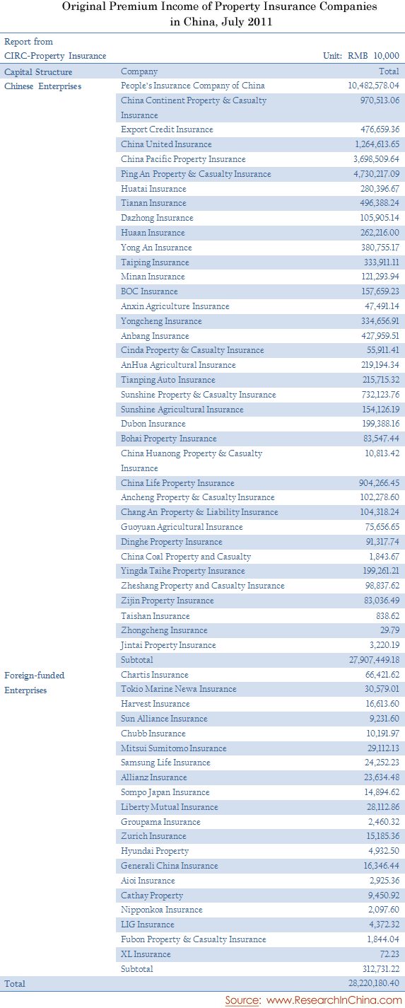 Original Premium Income of Property Insurance Companies in China, July 2011