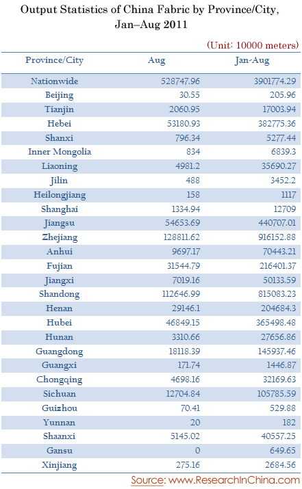 Output Statistics of China Fabric by Province/City, Jan–Aug 2011