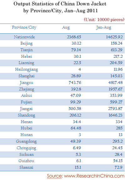 Output Statistics of China Down Jacket by Province/City, Jan–Aug 2011
