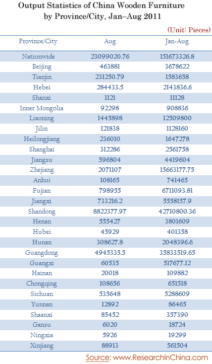 Output Statistics of China Wooden Furniture by Province/City, Jan–Aug 2011