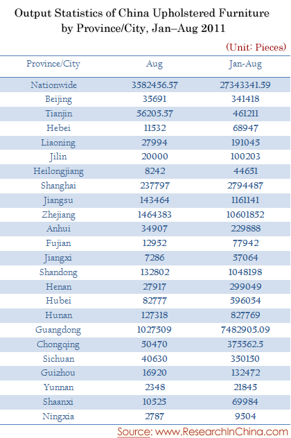 Output Statistics of China Upholstered Furniture by Province/City, Jan–Aug 2011