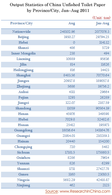 Output Statistics of China Unfished Toilet Paper by Province/City, Jan–Aug 2011