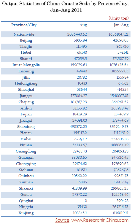 Output Statistics of China Caustic Soda by Province/City, Jan–Aug 2011