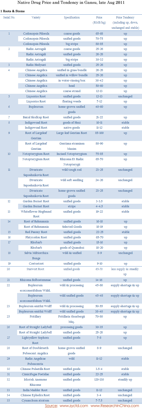Native Drug Price and Tendency in Gansu, late Aug 2011(1)