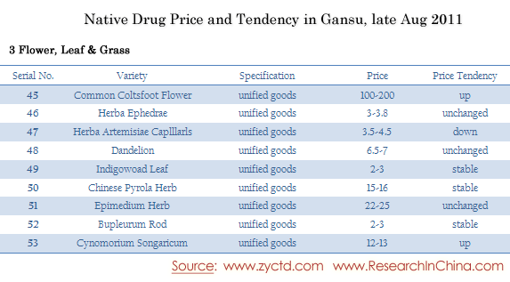 Native Drug Price and Tendency in Gansu, late Aug 2011(3)