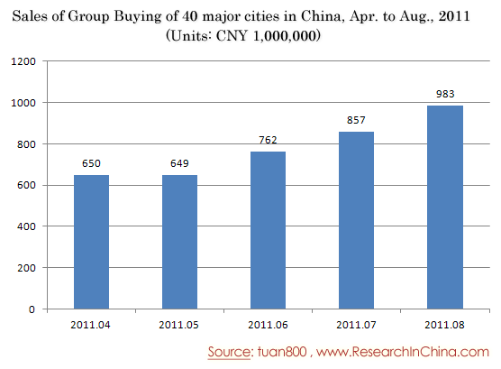 Sales of Group Buying of 40 major cities in China, Apr. to Aug., 2011 (Units: CNY 1,000,000)