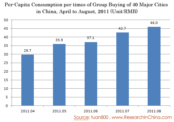 Per-Capita Consumption per times of Group Buying of 40 Major Cities in China, April to August, 2011 (Unit:RMB)