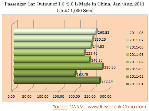 Passenger Car Output of 1.6 -2.0 L Made in China, Jan.-Aug. 2011