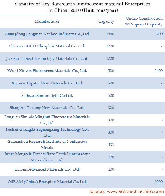 Capacity of Key Rare-earth luminescent material Enterprises in China, 2010
