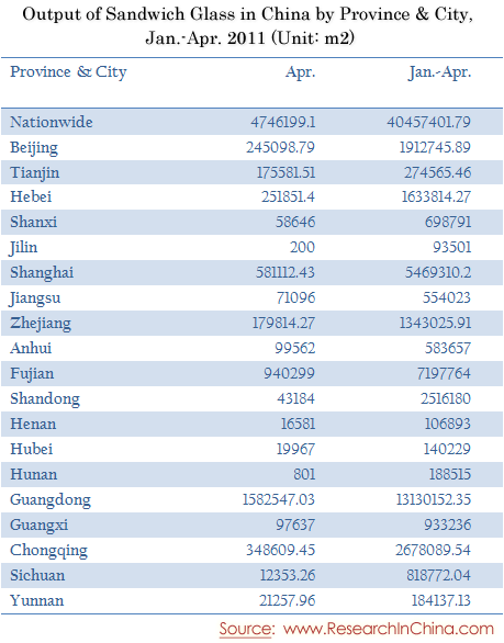 Output of Sandwich Glass in China by Province & City, Jan.-Apr. 2011