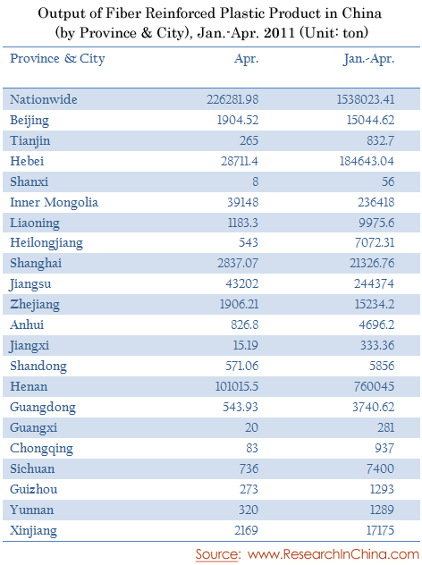 Output of Fiber Reinforced Plastic Product in China (by Province & City), Jan.-Apr. 2011
