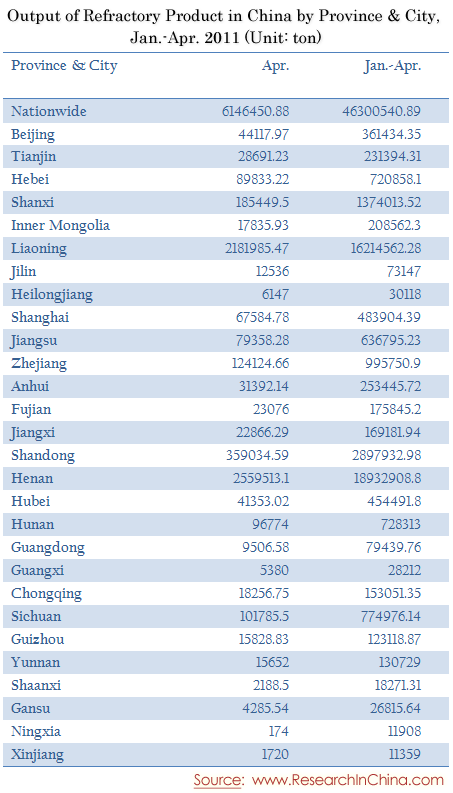 Output of Refractory Product in China by Province & City, Jan.-Apr. 2011